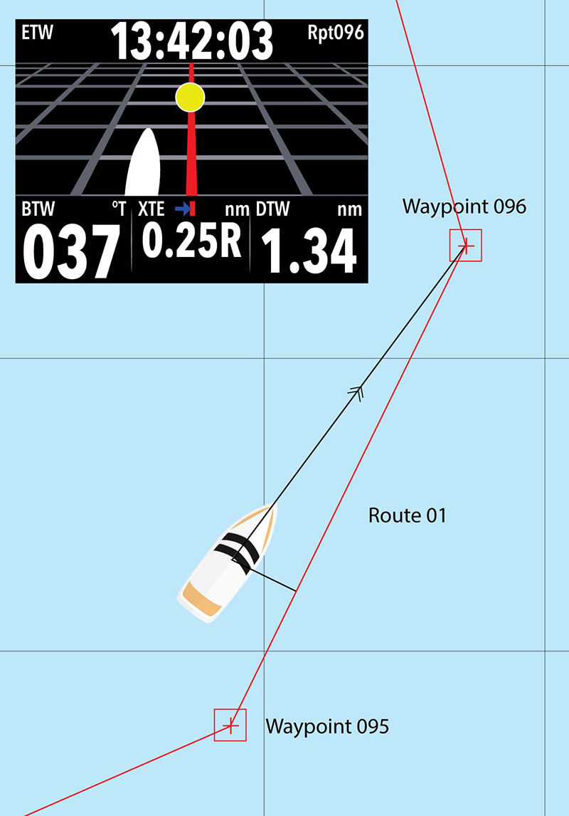 Давайте расширим наш пример, чтобы показать, что мы движемся по маршруту 01, на участке между точками 095 и 096. Вы управляете вручную и отклонились от курса влево. Ваш XTE составляет 0,25 нм (см. рис. 3).