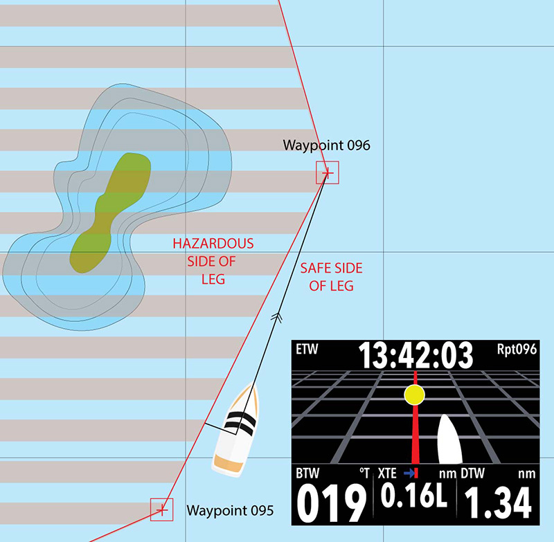 В нашем примере (см. рис. 6) вы можете использовать маршрут между точками 095 и 096 в качестве «линии освобождения». Вы сразу поймете, что находитесь в безопасной воде, если XTE равен нулю или находится справа от трассы между точками маршрута.