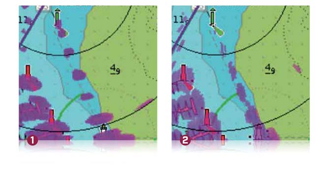 FЭксклюзивная усовершенствованная технология разделения целей ATX™ от LIR отображает такие цели, как лодки, ориентиры, камни, буи и погодные ячейки, с непревзойденным разрешением и качеством разделения. (1) Квантовый радар (2) Обычный магнетронный радар